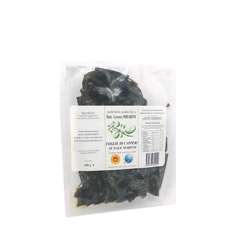Le Foglie di Cappero sotto sale sono una conserva tipica delle Isole Eolie dove questi preziosi capperi nascono e vengono racconti nel periodo estivo. La Foglia di cappero ha un caratteristico sapore sapido, tipico dei capperi, con una persistente nota acidula.