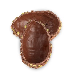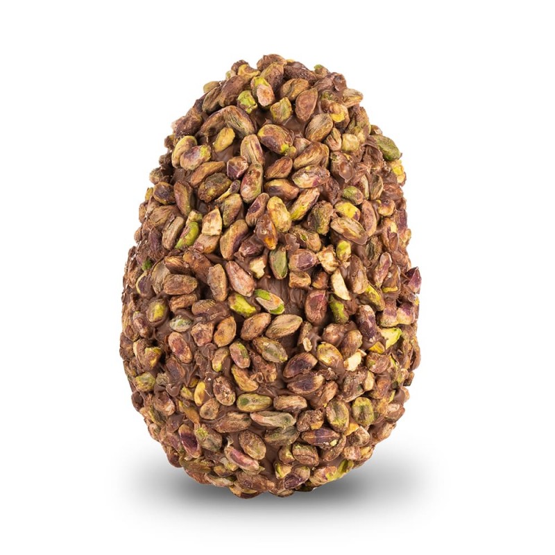 Uovo di cremoso cioccolato al latte, arricchito da una irresistibile copertura di croccanti pistacchi interi.
