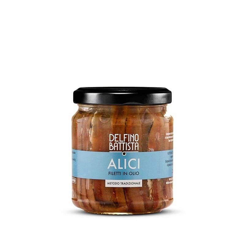 Alici Sott' Olio realizzate dall'azienda Delfino Battista di Cetara. Un'azienda a conduzione familiare che ha fatto della propria passione un vero e proprio lavoro. Le alici sott'olio sono il prodotto tipico più apprezzato dai turisti che visitano il piccolo paesino situato all'interno di una delle costiere più amate del mondo.