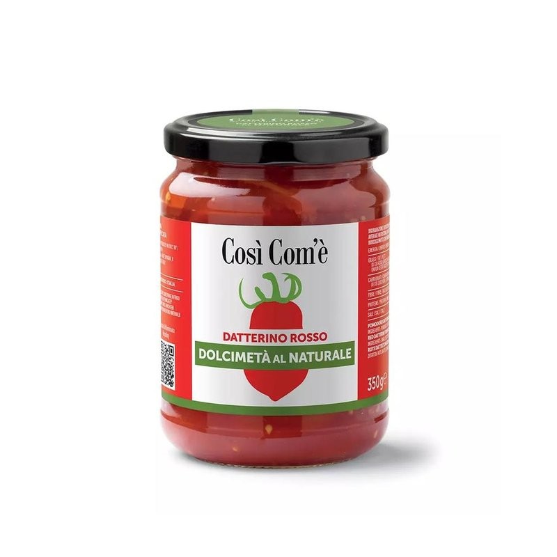 Le Dolcimetà di datterino rosso al naturale Così Com’è sono pomodorini datterini tagliati a metà e conservati nel loro succo. Dolci, intensi e pronti all’uso, sono ideali per pizza gourmet, bruschette e sughi veloci.